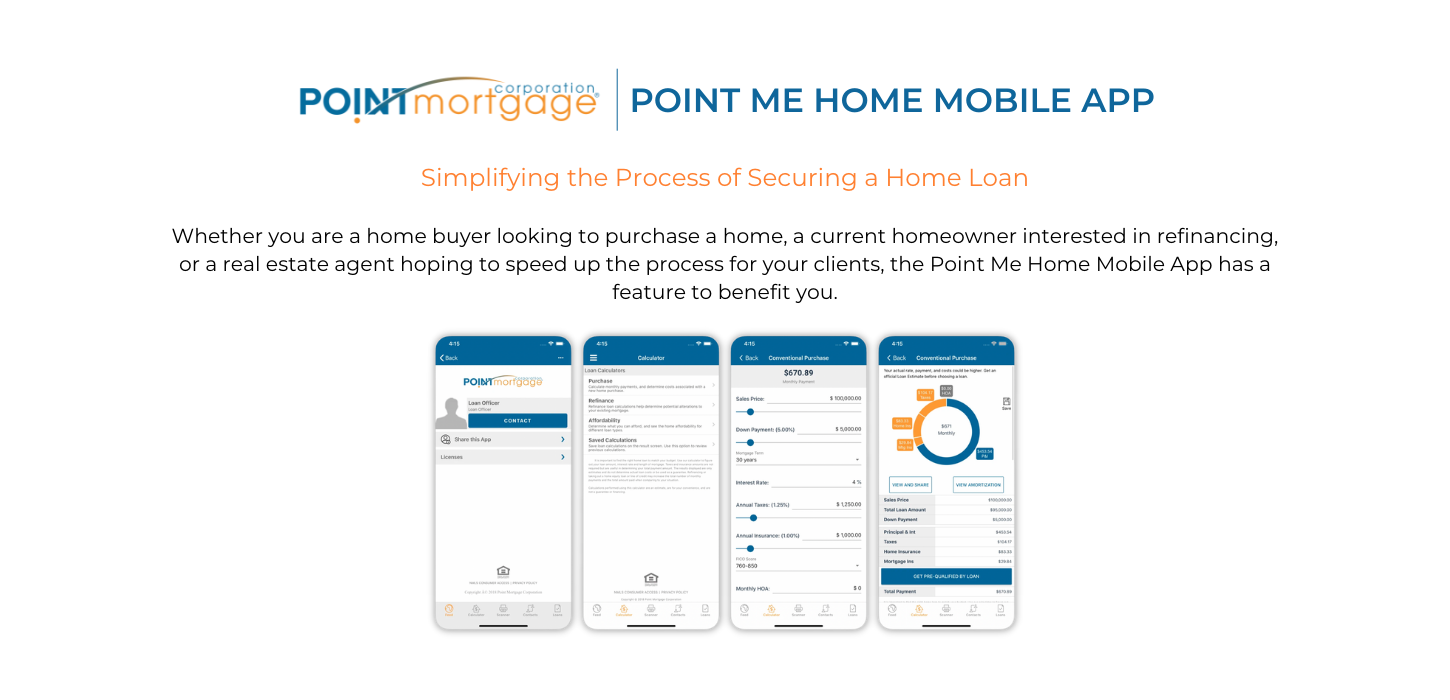 The calculations provided by the Point Me Home Mobile App are useful in giving you an idea of what homeownership might mean for you. Additionally, the app can connect you with a Point Mortgage Corporation Loan Officer for a customized solution tailored to your specific financial situation, needs, and goals.